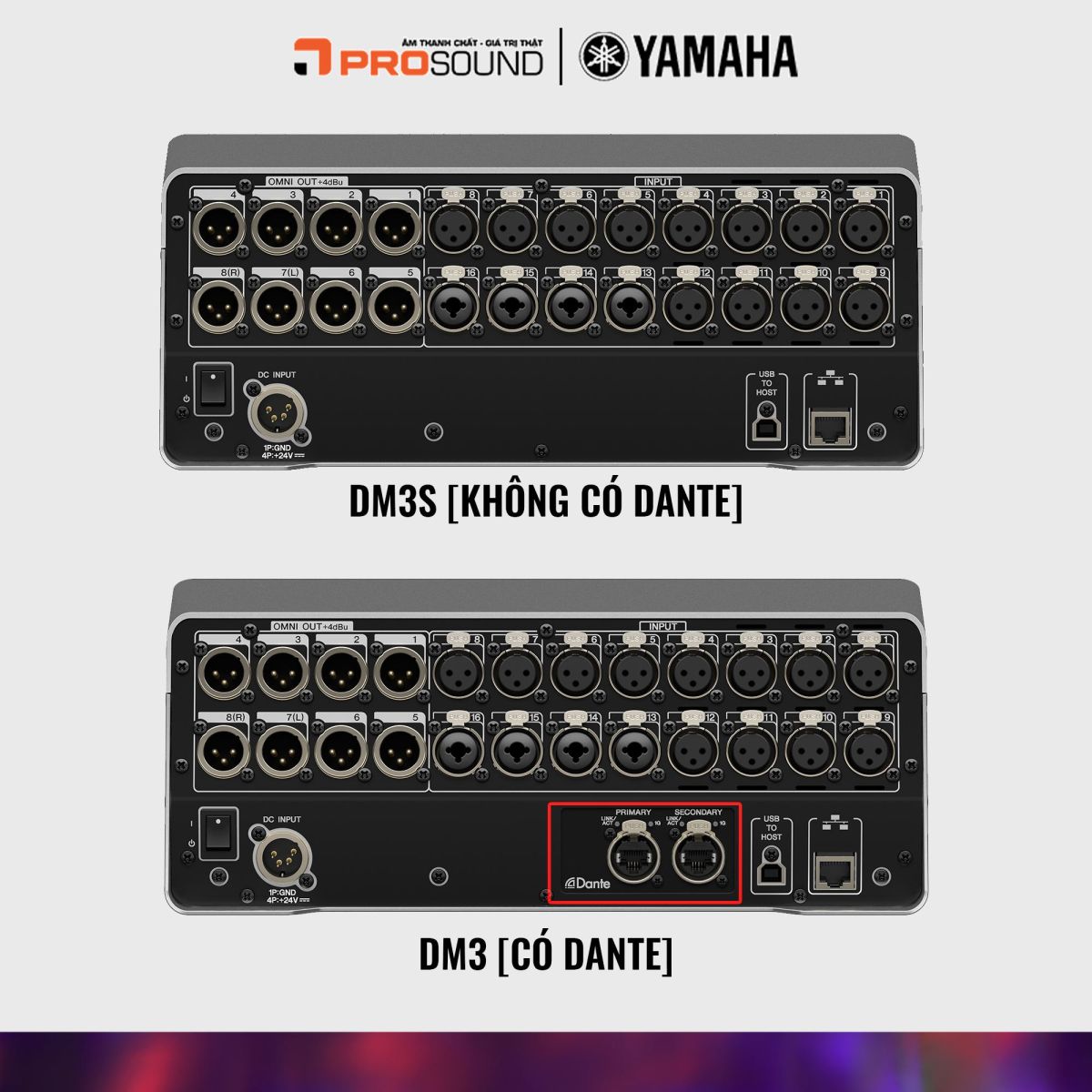 Mixer DM3 có 2 phiên bản, một là phiên bản thường với mã DM3 tích hợp Dante, còn lại là phiên bản không có kết nối Dante với mã DM3S (DM3 Standard)