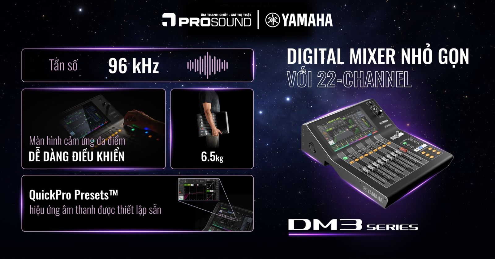 Trong một thế giới mà không gian là điều quý giá, Yamaha DM3 đã làm thay đổi mọi kỳ vọng. Dù có kích thước nhỏ gọn, bàn trộn âm này không hề thỏa hiệp về sức mạnh hay khả năng. Nó được thiết kế dành cho các chuyên gia yêu cầu chất lượng xử lý âm thanh cao nhất trong một gói di động. DM3 dễ dàng tích hợp vào bất kỳ thiết lập phòng thu, giàn âm thanh biểu diễn trực tiếp, hoặc môi trường phát sóng nào, trở thành công cụ không thể thiếu cho các kỹ sư âm thanh di động.