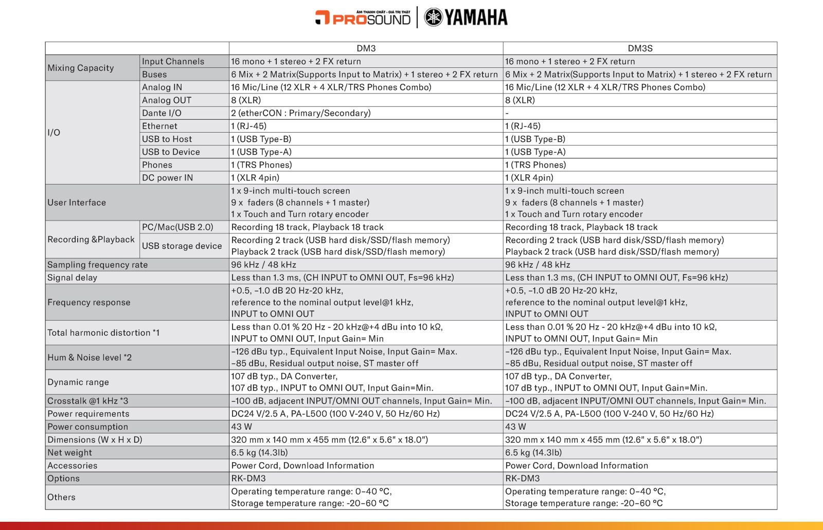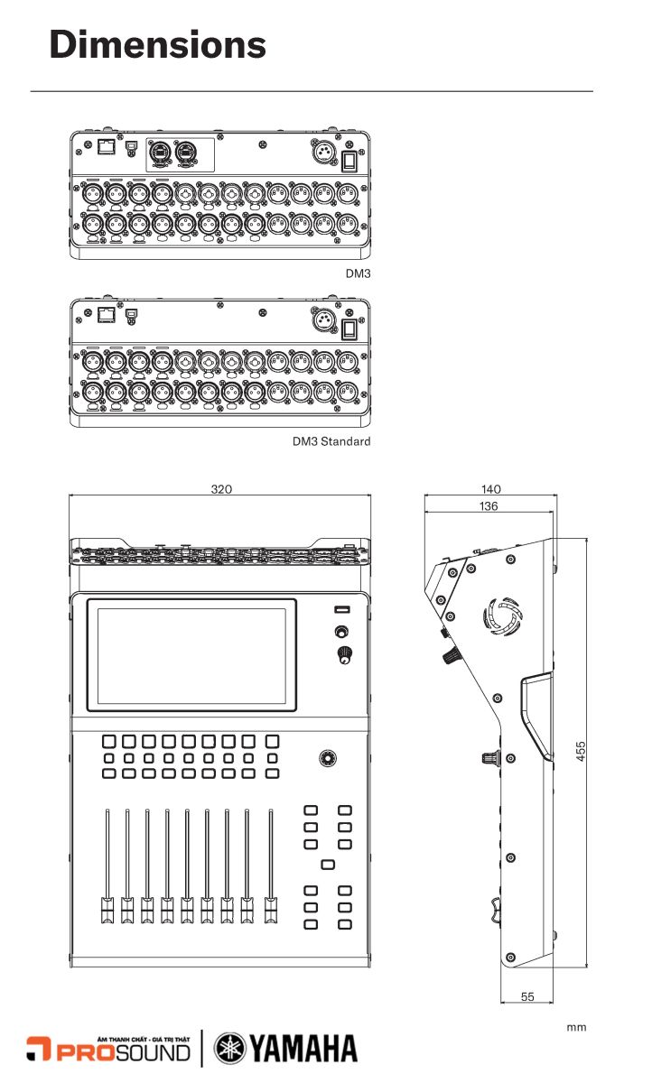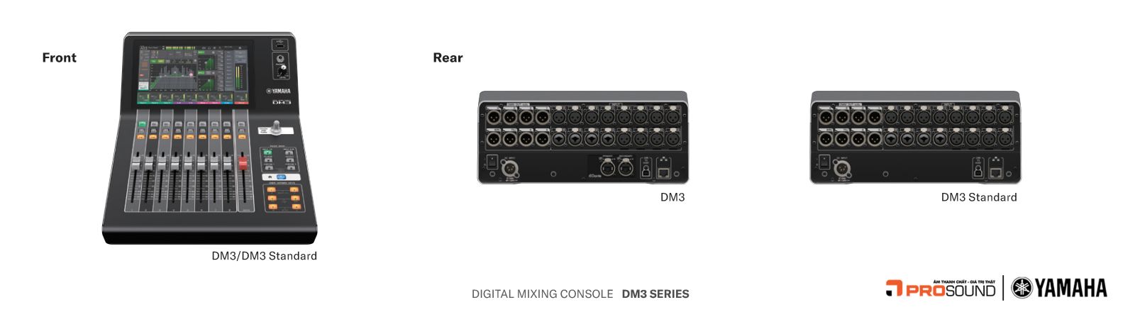 Mixer DM3 có 2 phiên bản, một là phiên bản thường với mã DM3 tích hợp Dante, còn lại là phiên bản không có kết nối Dante với mã DM3S (DM3 Standard)
