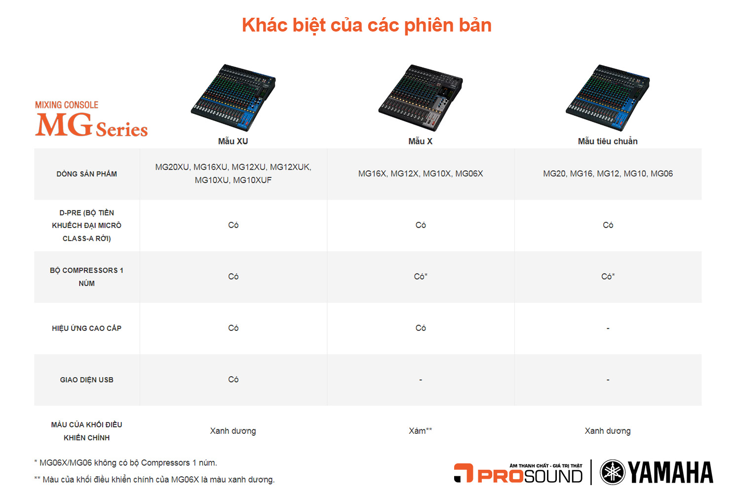 Các mẫu mixer trong dòng Yamaha MG Series bao gồm các phiên bản MG, MGX và MGXU, với mỗi phiên bản mang đến các tính năng khác nhau để phù hợp với nhu cầu của người dùng. Dưới đây là sự khác biệt giữa chúng: