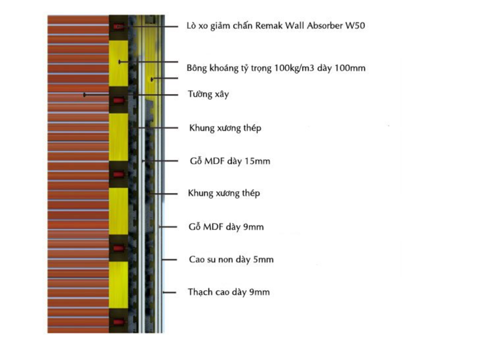 Cấu tạo vách âm sử dụng đệm lò xo giảm chấn cách âm và vách tiêu chuẩn