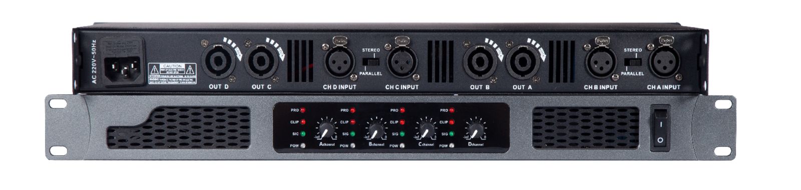 Mặt trước của ampli được thiết kế tối giản, dễ quan sát tình trạng hoạt động, trong khi mặt sau bố trí đầy đủ cổng kết nối đầu vào/ra tiêu chuẩn, giúp việc đấu nối nhanh chóng và an toàn.