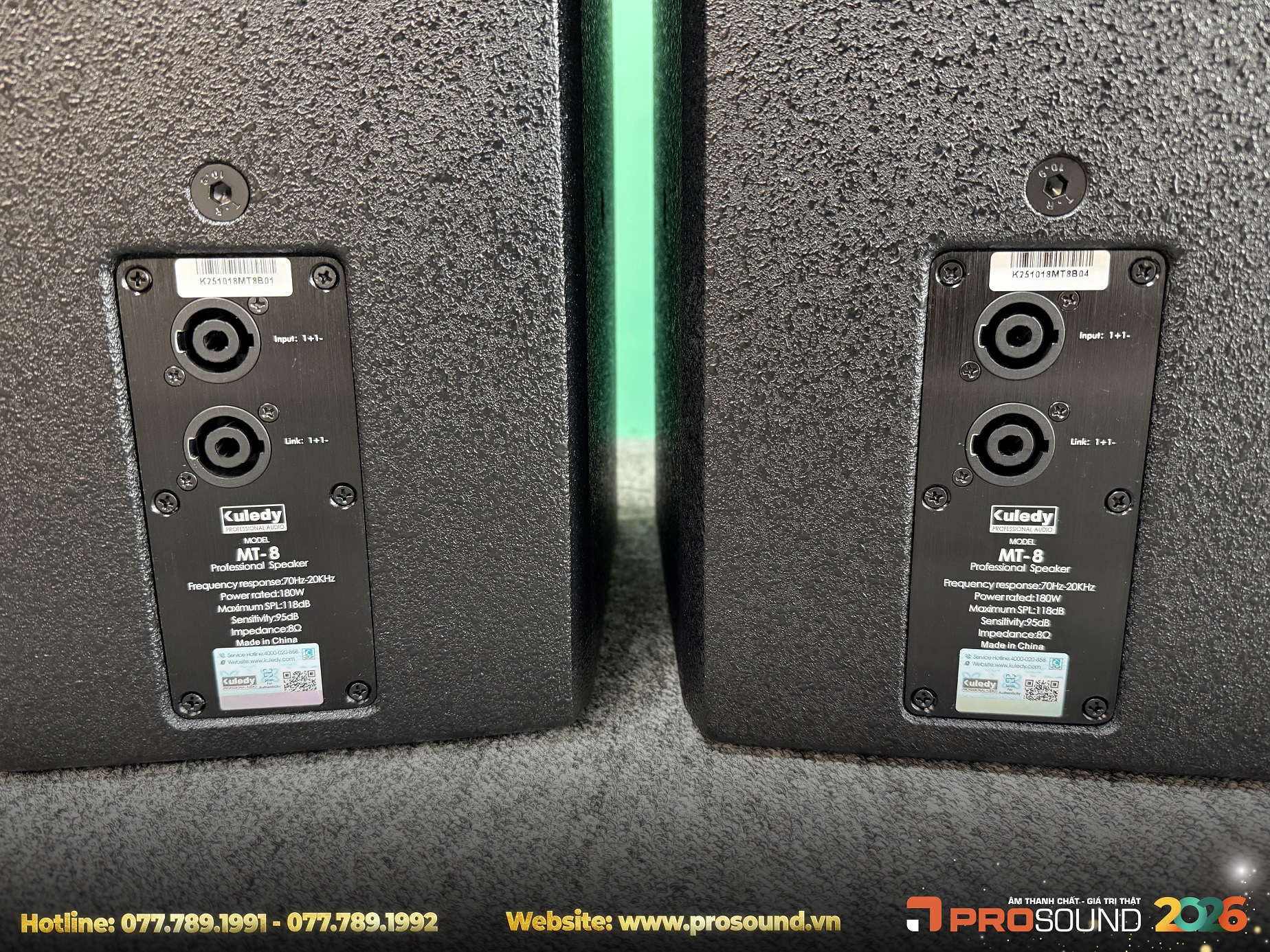 Về công suất, Kuledy MT-8 có mức 180W RMS, 360W Program và 720W Peak, đủ sức đáp ứng nhu cầu sử dụng liên tục trong karaoke gia đình cao cấp hoặc phòng kinh doanh nhỏ. Công suất này giúp loa hoạt động ổn định, ít méo tiếng khi mở lớn và không đòi hỏi ampli hay cục đẩy quá mạnh.