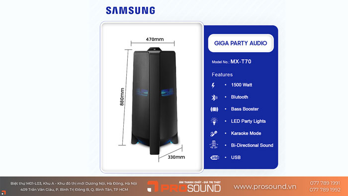 Samsung MX-T70 là mẫu loa tháp hiện đại của Samsung, nổi bật với thiết kế mạnh mẽ và công suất âm thanh ấn tượng. Với các tính năng tiên tiến như công nghệ âm thanh vòm 360 độ, kết nối không dây đa dạng, và khả năng chống nước, MX-T70 là sự lựa chọn lý tưởng cho những buổi tiệc sôi động hoặc không gian giải trí gia đình. Bài viết này của Prosound Việt Nam sẽ giúp bạn đánh giá chi tiết về Samsung MX-T70 để hiểu rõ vì sao đây là mẫu loa tháp đáng cân nhắc cho mọi nhu cầu âm thanh.