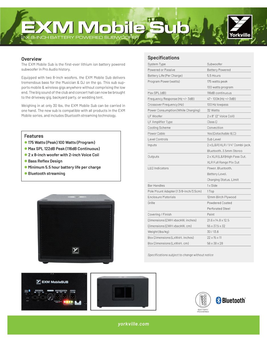 Yorkville EXM Mobile Sub là sản phẩm loa siêu trầm (subwoofer) di động đầu tiên trong ngành âm thanh chuyên nghiệp sử dụng pin lithium-ion thay vì nguồn điện trực tiếp. Đây là bước đột phá thực sự trong việc tối ưu hóa hiệu suất và tính cơ động cho các buổi biểu diễn ngoài trời, không gian không có điện lưới hoặc các sự kiện yêu cầu tính linh hoạt cao.