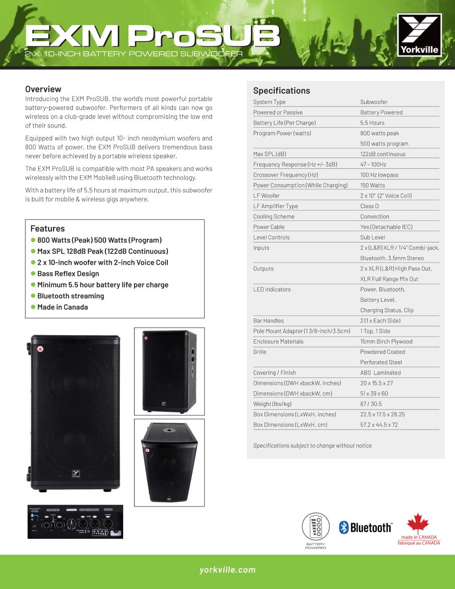 EXM ProSub tương thích với hầu hết các loa PA và hoạt động không dây với loa EXM Mobile8 bằng công nghệ Bluetooth®.