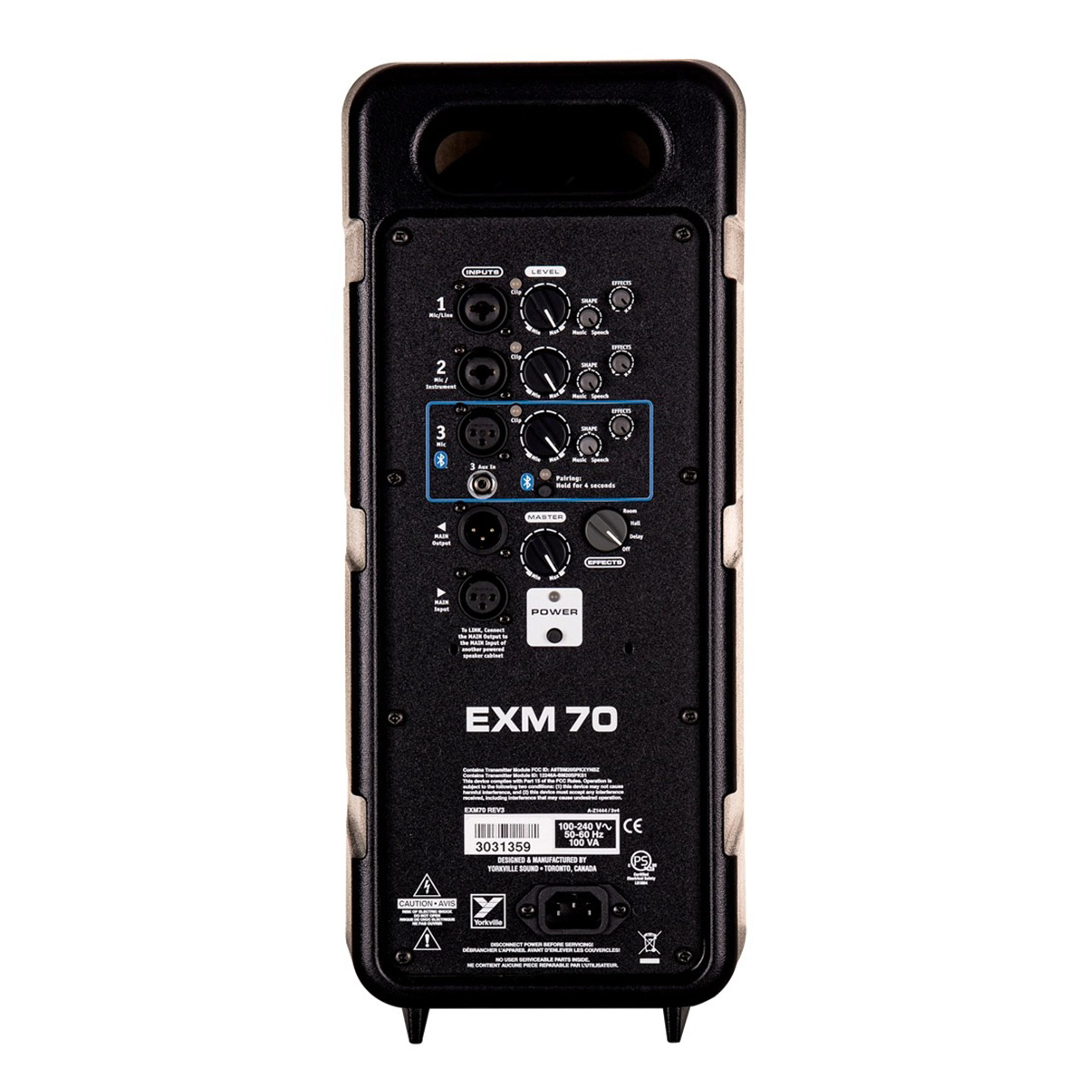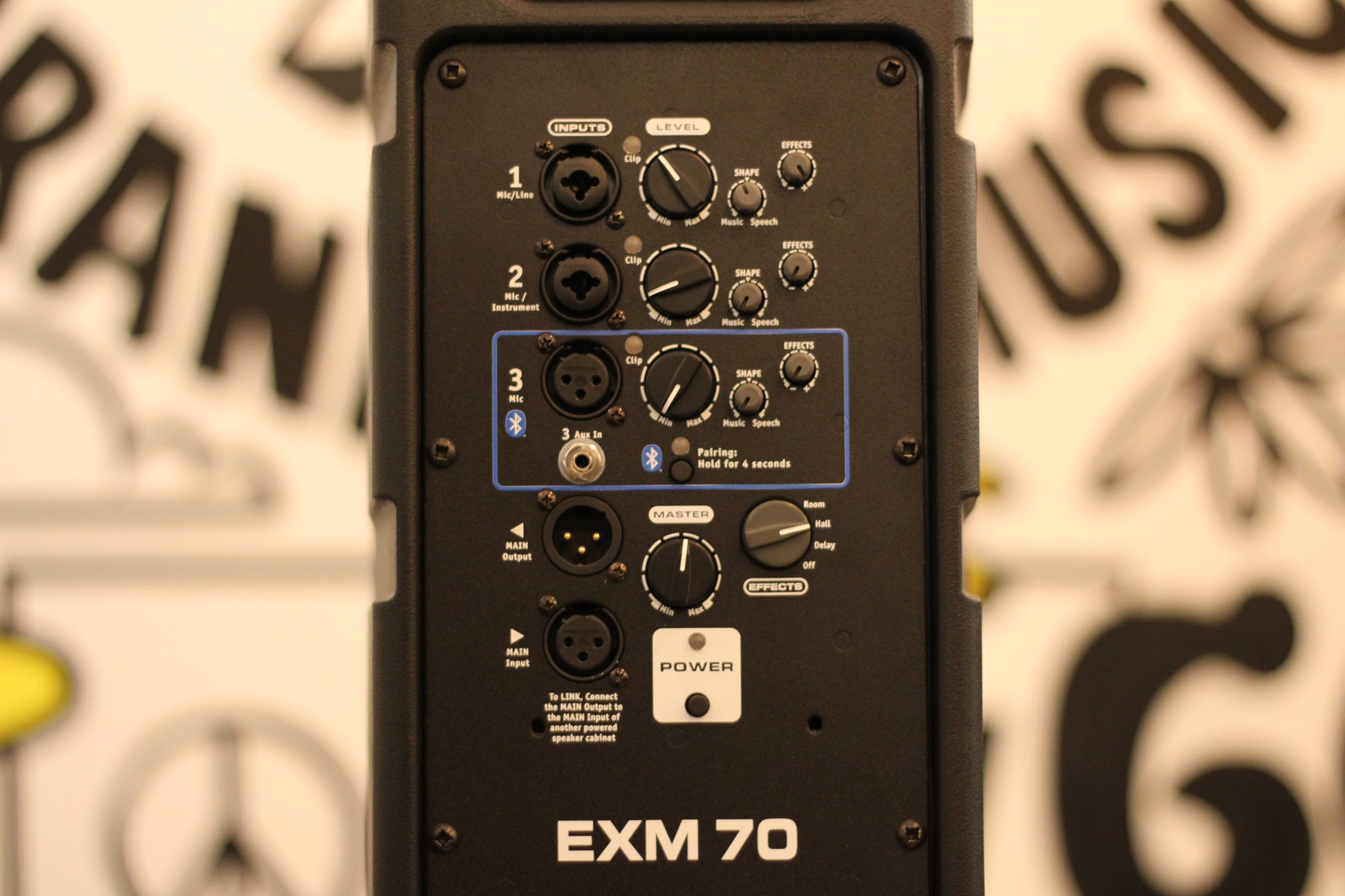 Với khả năng kết nối đa dạng và hiệu ứng tích hợp, EXM70 có thể được sử dụng như một giải pháp độc lập cho nghệ sĩ solo và bộ đôi mà không cần bộ trộn âm bên ngoài. Ngoài đầu vào và đầu ra chính, mặt sau của loa có ba kênh: mic/line, mic/nhạc cụ và mic/aux/Bluetooth®. Mỗi kênh đều có nút "Shape" để tối ưu EQ cho âm nhạc hoặc giọng nói, và một nút "Effects" để thêm hiệu ứng reverb hoặc delay.