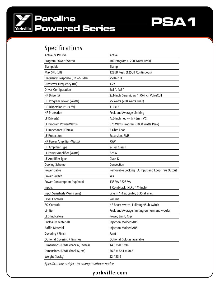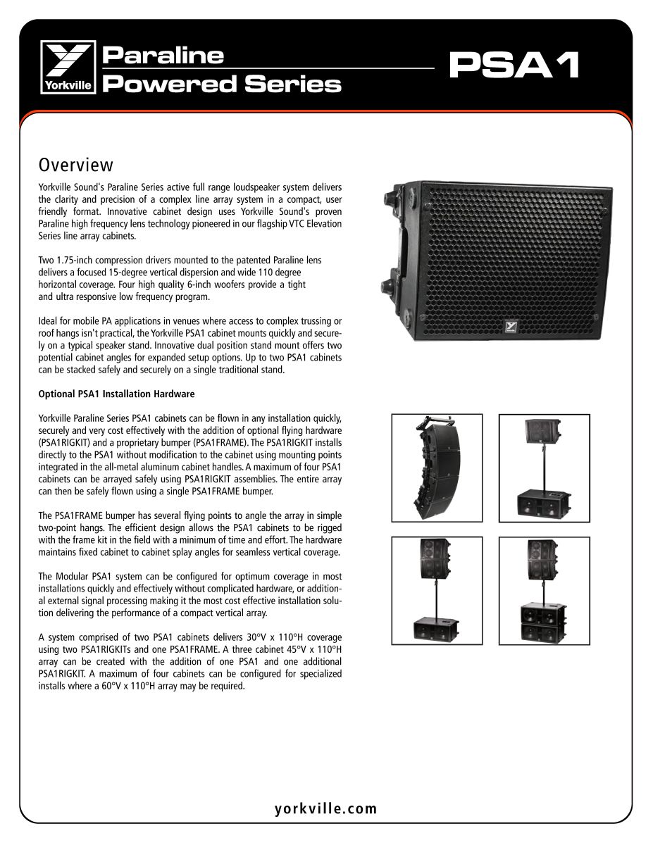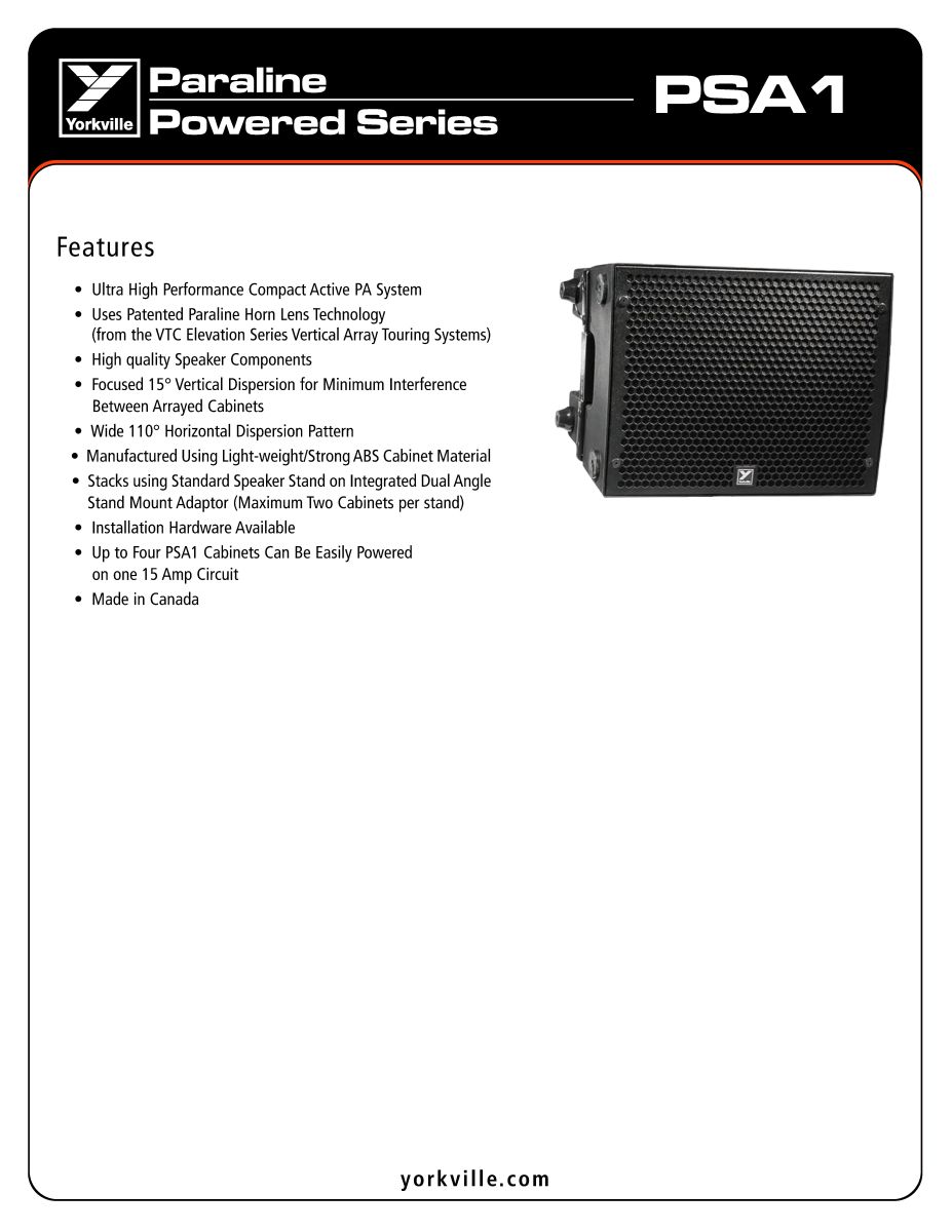 PSA1 là mẫu loa liền công suất 4 x 6 inch thuộc dòng Paraline Series của Yorkville Sound (Canada), được phát triển nhằm mang lại độ rõ nét, chính xác và khả năng kiểm soát hướng tính của line array, nhưng trong một thiết kế nhỏ gọn, dễ lắp đặt và tiết kiệm chi phí hơn rất nhiều so với các hệ line array cỡ lớn truyền thống.