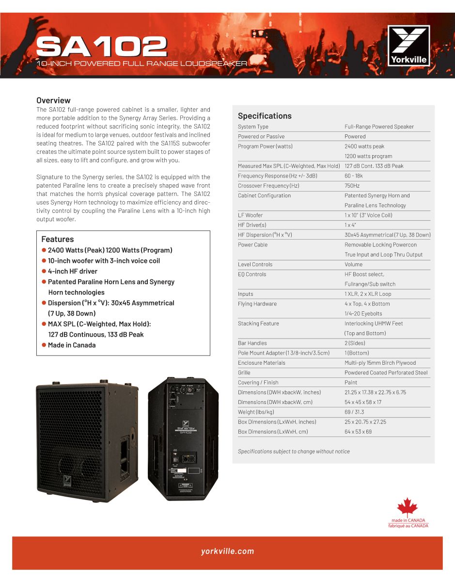SA102 là mẫu loa full-range liền công suất 10 inch thuộc dòng Synergy Series của Yorkville Sound (Canada). Đây là model được phát triển để mở rộng hệ Synergy theo hướng nhẹ hơn, gọn hơn nhưng vẫn giữ đầy đủ sức mạnh và khả năng kiểm soát hướng tính đặc trưng của dòng point source cao cấp này.