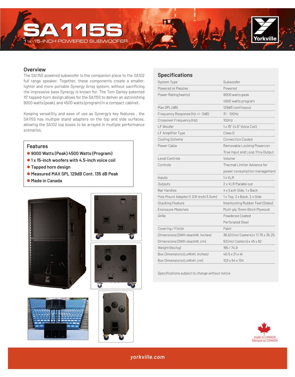 SA115S là subwoofer liền công suất nhỏ gọn nhất trong dòng Synergy Series của Yorkville Sound (Canada), nhưng lại sở hữu sức mạnh khiến nhiều hệ sub lớn phải dè chừng. Đây là model được thiết kế để kết hợp hoàn hảo với loa full-range SA102, tạo nên một hệ thống Synergy cực kỳ hiệu quả cho sân khấu vừa và lớn.