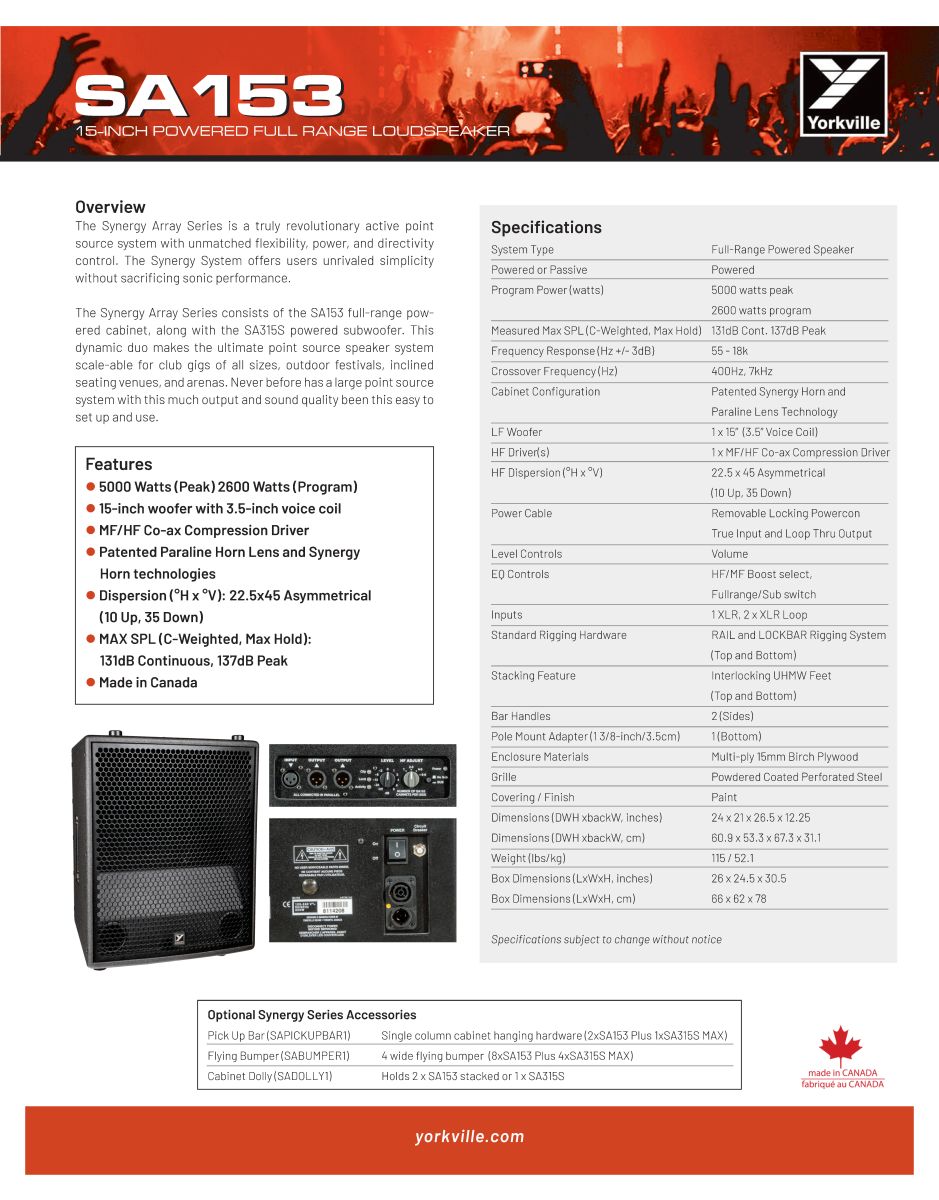 SA153 là model full-range mạnh nhất trong dòng Synergy Array Series, đồng thời là loa point source flagship của Yorkville Sound (Canada). Với công suất cực lớn, khả năng kiểm soát hướng tính chính xác và thiết kế tối ưu cho lắp đặt cũng như touring, SA153 đủ sức đáp ứng từ club quy mô lớn, nhà hát ngoài trời đến sân khấu arena.