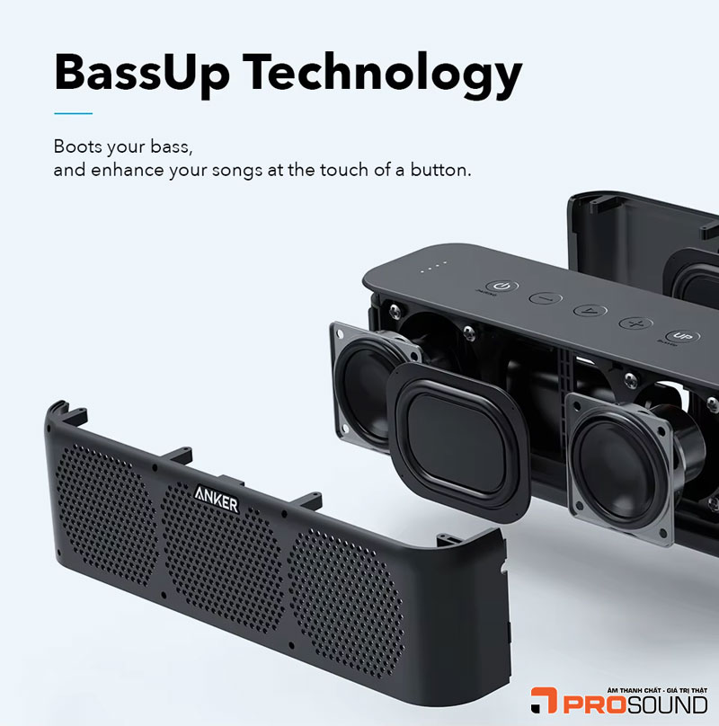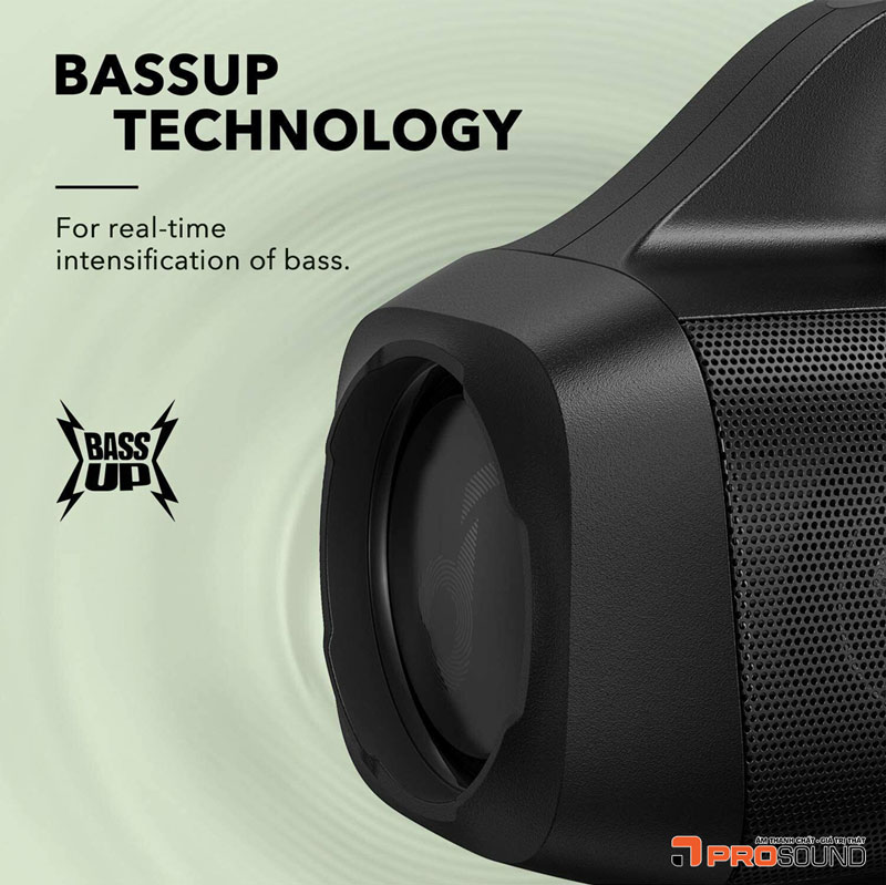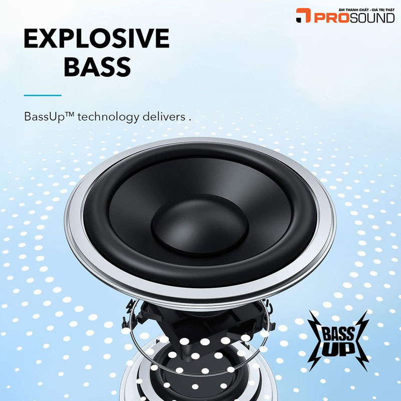 BassUp là công nghệ tăng cường âm trầm thông minh, được phát triển bởi thương hiệu Anker (Soundcore), và ngày nay đã được ứng dụng rộng rãi trong nhiều thiết bị âm thanh hiện đại như loa Bluetooth, tai nghe không dây, soundbar...