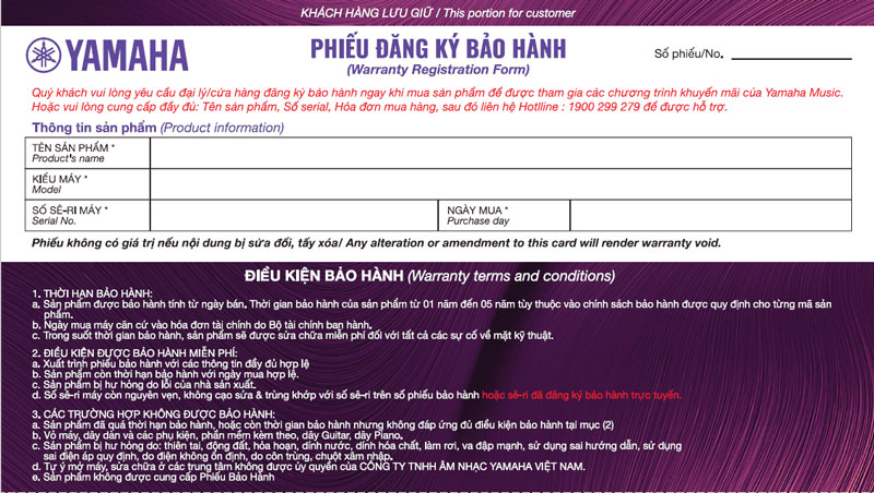 Sản phẩm Yamaha chính hãng luôn đi kèm với phiếu bảo hành có thông tin rõ ràng. Phiếu này bao gồm tên sản phẩm, số serial của sản phẩm, ngày mua hàng, thông tin của người bán và thông tin liên hệ của đại lý ủy quyền, điều khoản và điều kiện bảo hành chi tiết.