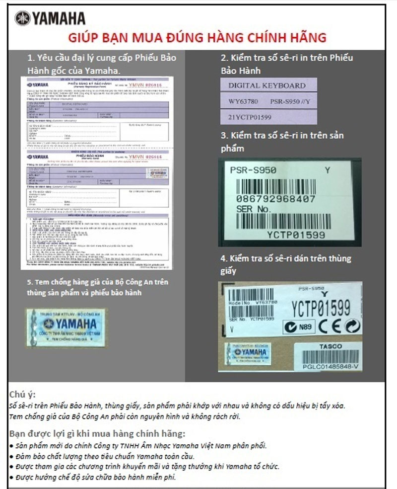 Một cách quan trọng khác để xác định sản phẩm Yamaha thật là kiểm tra phiếu bảo hành có trong thùng sản phẩm.