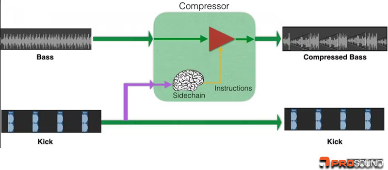 Khi tiếng trống Kick vang lên, tín hiệu của nó sẽ kích hoạt Compressor trên track Bass. Compressor này sẽ tự động giảm âm lượng của tiếng Bass xuống một chút, tạo ra một "khoảng trống" để tiếng trống Kick có thể nổi bật và nghe rõ hơn.