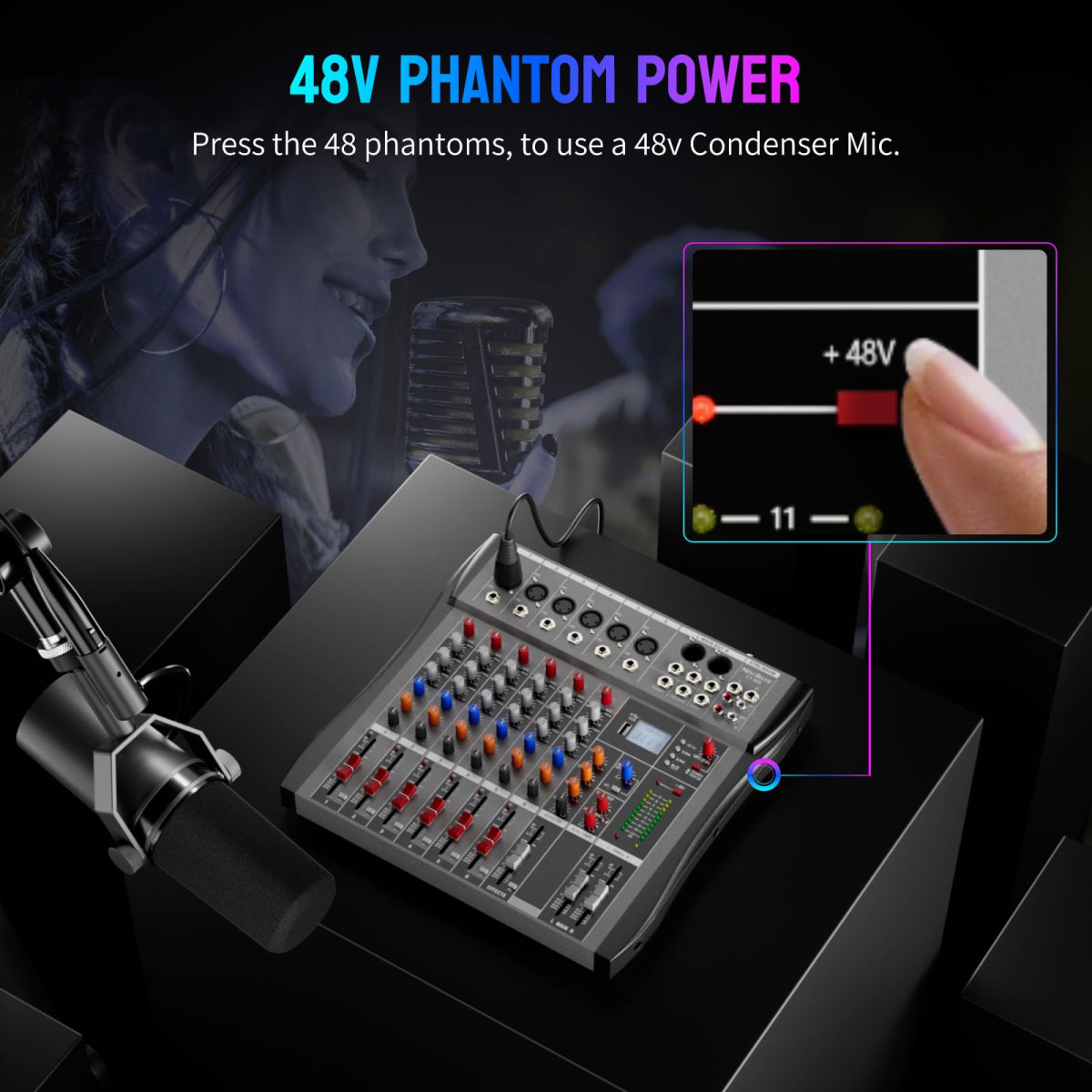 Quy trình tắt/mở: Luôn cắm micro vào dây, dây vào Mixer trước khi nhấn nút +48V. Khi tháo ra, hãy tắt nguồn 48V trước, đợi vài giây rồi mới rút dây.