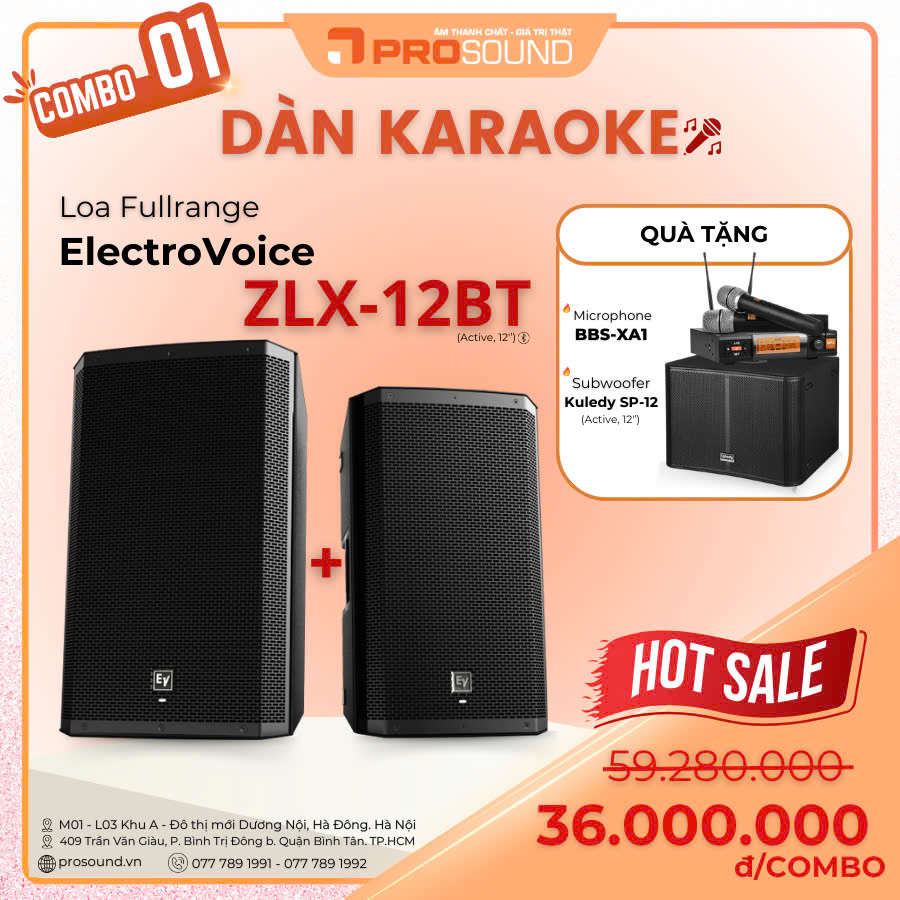 1. Dàn Karaoke Fullrange ElectroVoice ZLX-12BT, Microphone BBS-XA1, Subwoofer Kuledy SP-12