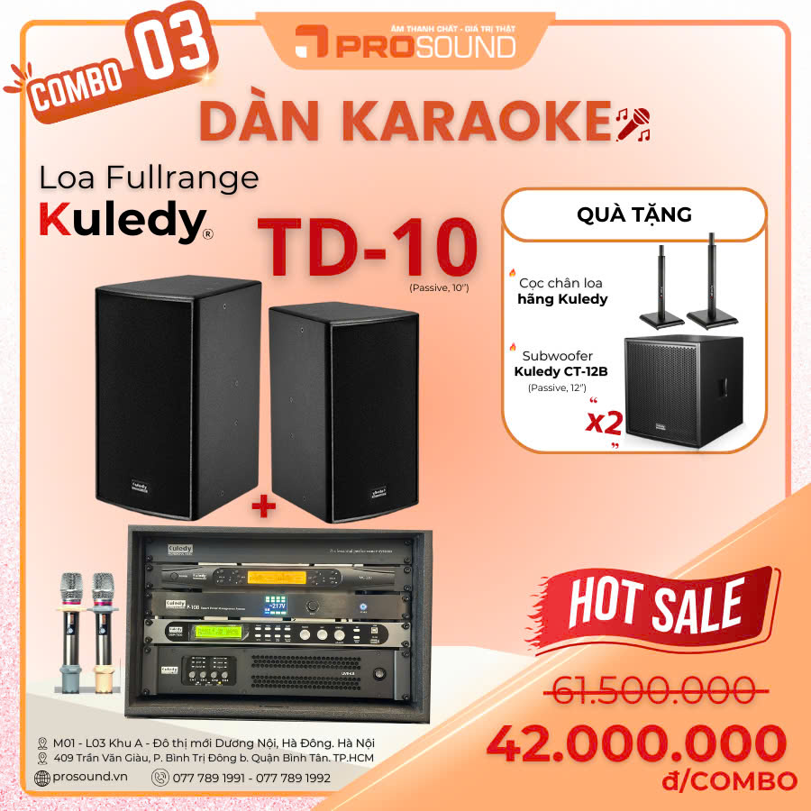 3. Combo Dàn Karaoke Fullrange Kuledy TD-10, Microphone, 2 Subwoofer Kuledy CT-12B, Cọc chân loa hãng Kuledy
