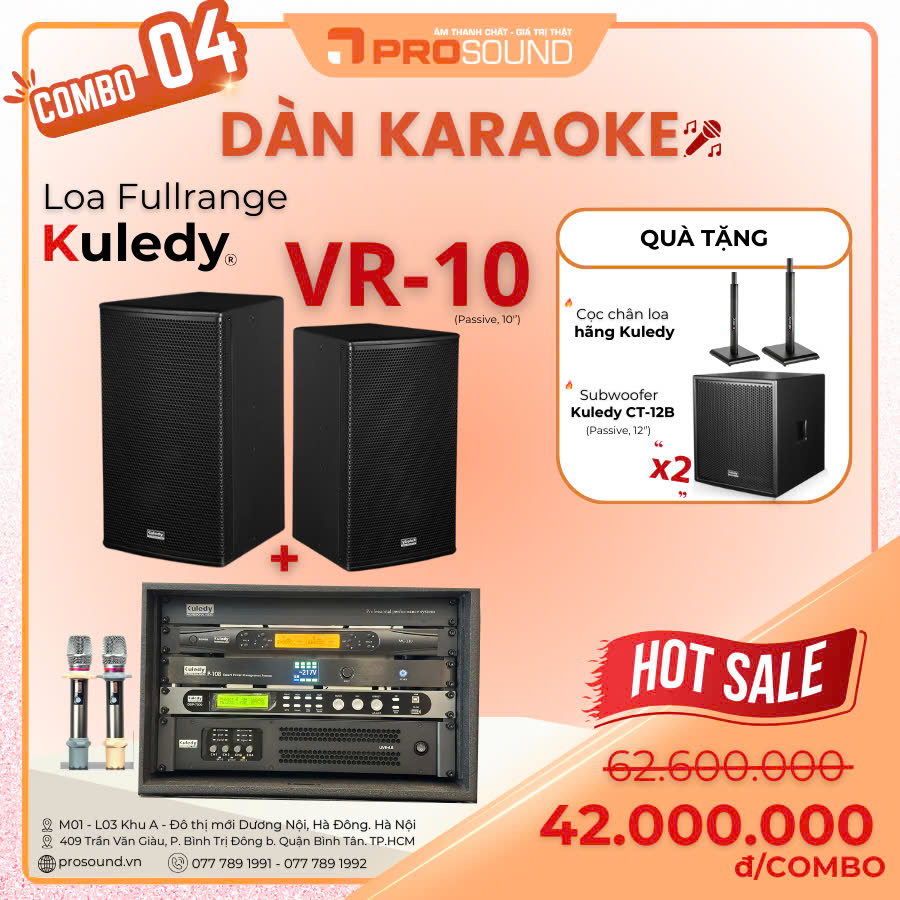 4. Combo Dàn Karaoke Fullrange Kuledy VR-10, Microphone, 2 Subwoofer Kuledy CT-12B, Cọc chân loa hãng Kuledy