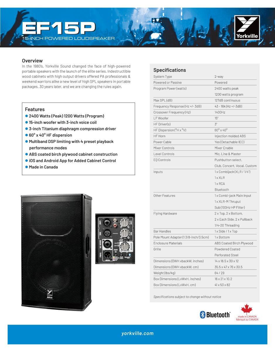 Bộ lọc high-pass 100 Hz giúp EF15P phối ghép trực tiếp với subwoofer mà không cần crossover ngoài. Ngoài ra, loa hỗ trợ kết nối Bluetooth để điều khiển các thông số DSP thông qua ứng dụng trên iOS và Android, giúp việc setup nhanh chóng và chính xác hơn.