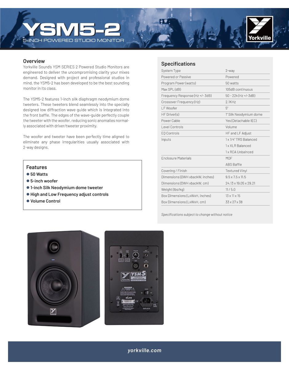 YSM5-2 là thế hệ studio monitor thuộc dòng YSM Series 2 của Yorkville Sound, tiếp nối tiêu chuẩn chính xác và trung thực đã làm nên tên tuổi dòng YSM-1 huyền thoại. Đây là lựa chọn lý tưởng cho phòng thu tại nhà, phòng thu cá nhân, project studio hay hệ thống âm thanh chuyên nghiệp, giúp người dùng mix và sản xuất âm thanh với sự tự tin và chính xác.