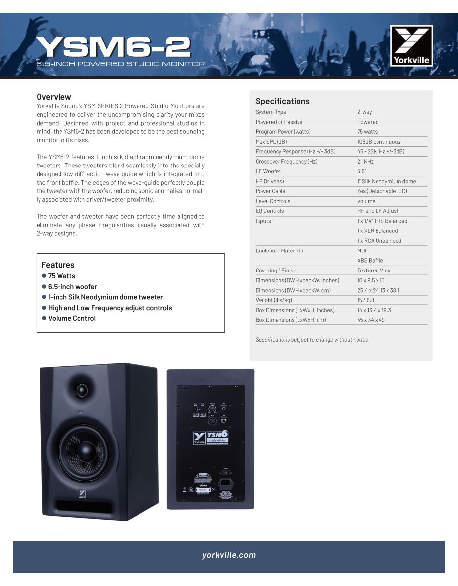 YSM6-2 là mẫu studio monitor thuộc dòng YSM Series 2 của Yorkville Sound, tiếp tục kế thừa truyền thống trung thực và độ chính xác cao trong tái tạo âm thanh mà thương hiệu đã khẳng định với dòng YSM-1 huyền thoại. Sản phẩm được thiết kế cho nhiều mô hình phòng thu khác nhau, từ home studio, project studio đến studio chuyên nghiệp, mang lại khả năng làm việc với âm thanh chuẩn và độ tin cậy cao.